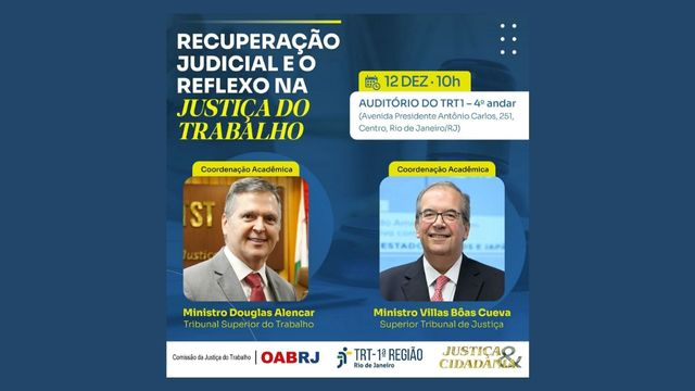O evento acontecerá no auditório do Tribunal Regional do Trabalho da 1ª Região (Presidente Antonio Carlos , 251 / 4º andar – Centro RJ), e contará com a coordenação acadêmica do Ministro Douglas Alencar Rodrigues, do Tribunal Superior do Trabalho (TST), e do Ministro Ricardo Villas Bôas Cueva, do Superior Tribunal de Justiça (STJ). A abertura será conduzida pelo presidente do TRT1, Desembargador Roque Lucarelli Dattoli.